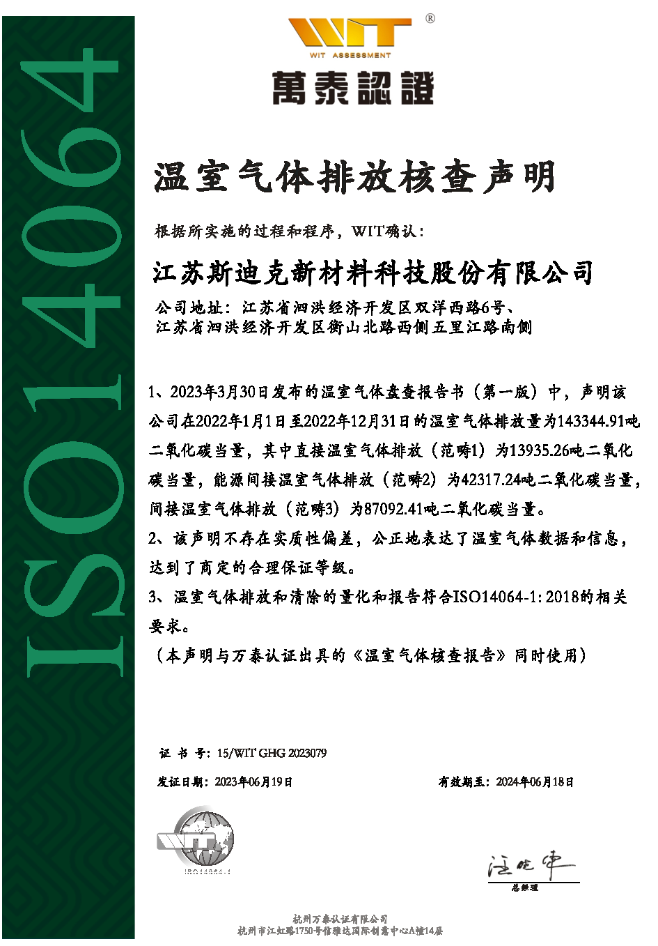 斯迪克獲《溫室氣體排放核查聲明》證書(shū)